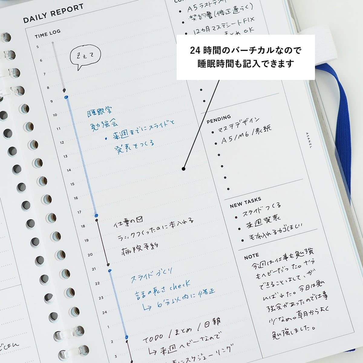 バーチカルのタイムラインが24時間なので、睡眠時間も記入できます。